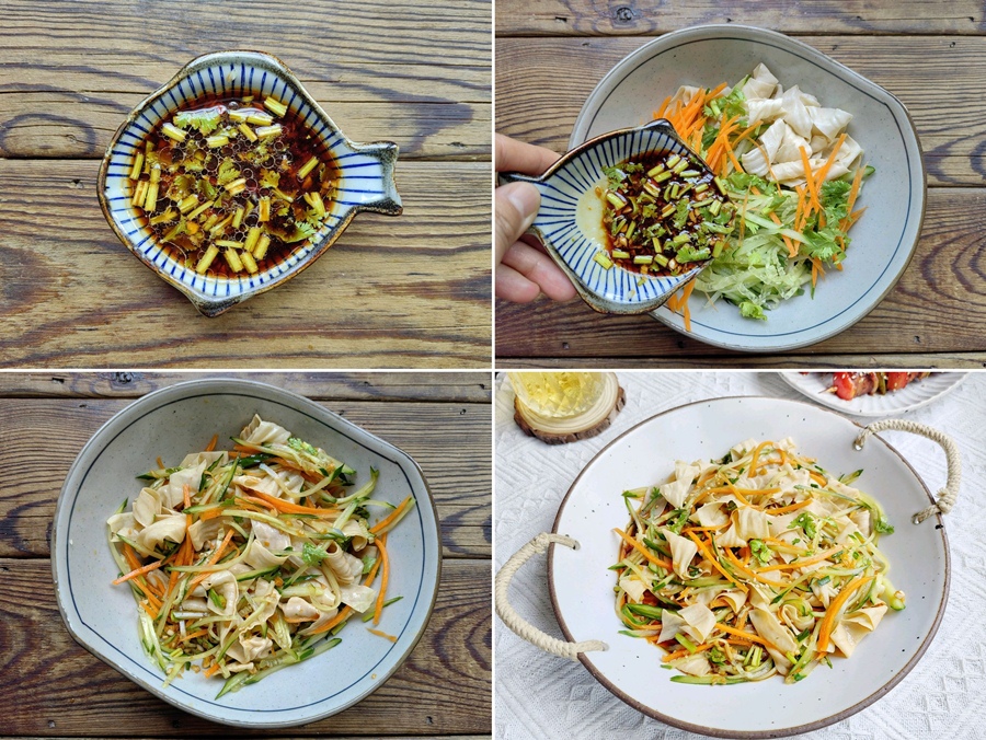 Bước 2: Lấy một bát nhỏ, cho tỏi băm và rau mùi thái nhỏ vào. Thêm 30ml nước tương, 15ml dầu hào, 15ml giấm, 5g đường, 5ml dầu mè rồi trộn đều. Cắt váng đậu thành miếng vừa ăn vào bát, thêm cà rốt và dưa chuột cùng rau mùi thái nhỏ vào. Sau đó rưới gia vị vừa pha lên trên rồi trộn đều. Cho váng đậu trộn ra đĩa là xong.