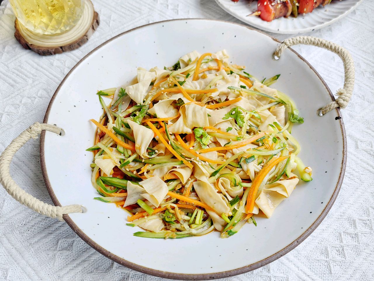 Bước 1: Váng đậu rửa sạch, ngâm nước ấm cho mềm. Cà rốt, dưa chuột sơ chế sạch rồi bào sợi. Tỏi băm nhỏ, rau mùi rửa sạch rồi thái nhỏ. Váng đậu sau khi ngâm mềm thì rửa sạch lại. Sau đó chần váng đậu qua nồi nước sôi khoảng 1 phút rồi vớt ra để ráo nước.