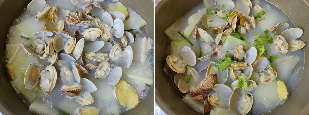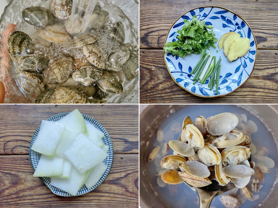 Bước 1: Ngao rửa sạch, ngâm nước muối cho ngao nhả hết cát rồi rửa sạch lại. Hành lá, gừng, rau mùi sơ chế sạch. Hành lá cắt khúc, rau mùi thái nhỏ, gừng thái lát. Bí đao gọt vỏ rồi thái lát. Đổ lượng nước vừa ăn vào nồi, thêm ngao vào rồi luộc cho đến khi ngao mở miệng thì vớt ngao ra.