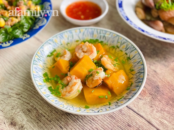 Nguyên liệu: 400g bí đỏ, 100g tôm biển, 1 ít mắm, 1 ít tiêu, muối, hành lá.