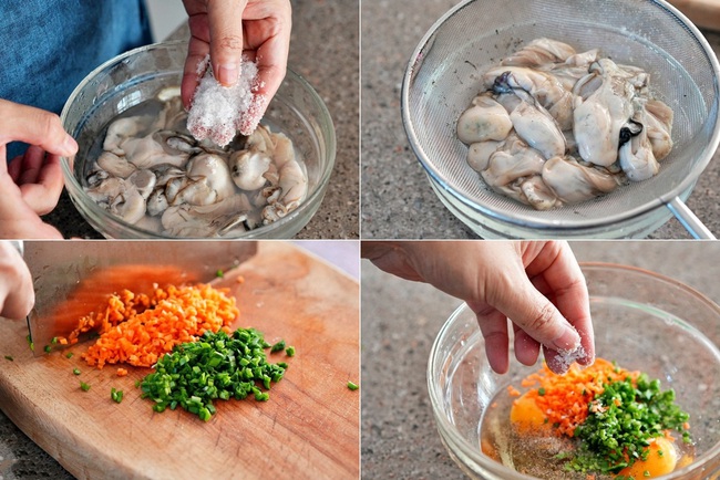 Bước 1: Cho hàu vào bát, thêm chút muối vào rồi bóp nhẹ. Rửa sạch hàu rồi để ráo nước. Hẹ và cà rốt sơ chế sạch rồi thái nhỏ. Đập trứng vào bát, thêm hẹ, cà rốt, muối, bột tiêu rồi đánh tan.