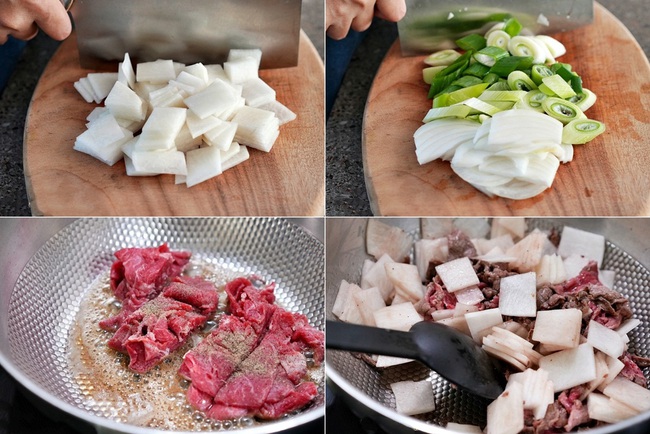 Bước 1: Củ cải gọt vỏ rửa sạch rồi thái thành lát mỏng. Hành tây bóc bỏ vỏ rồi thái lát, hành boa rô rửa sạch rồi thái lát chéo. Thịt bò sơ chế sạch rồi thái lát mỏng. Đun nóng dầu mè trong chảo, cho thịt bò và thêm chút bột tiêu vào. Xào ở lửa hơi nhỏ cho đến khi thịt bò chuyển màu. Đổ củ cải vào xào chung.