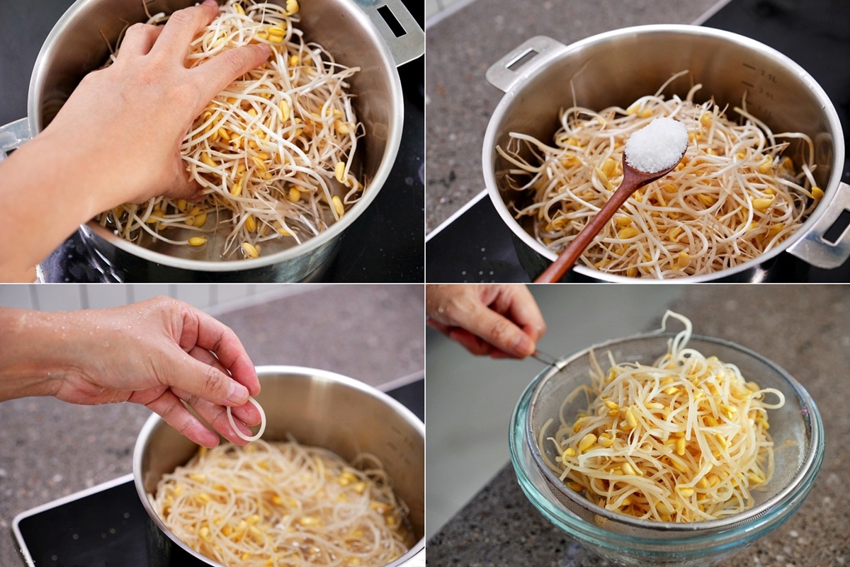 Bước 1: Giá đỗ nhặt sạch rễ rồi rửa sạch. Cho giá đỗ vào nồi, đổ lượng nước vào sao cho mực nước trong nồi bằng 1/3 lượng giá đỗ. Thêm muối vào khuấy đều rồi đun sôi, chần cho đến khi giá đỗ có thể uốn cong. Vớt giá đỗ ra ngâm trong tô nước lạnh một lúc rồi loại bỏ nước, để cho giá đỗ ráo nước.
