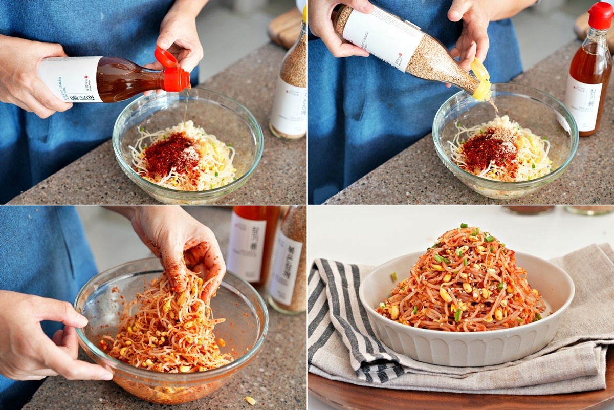 Bước 2: Cho giá đỗ vào bát tô, thêm ớt bột, nước mắm, đường, dầu mè, tỏi băm, vừng rang, hành lá thái nhỏ vào trộn đều là xong.