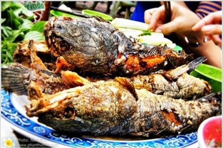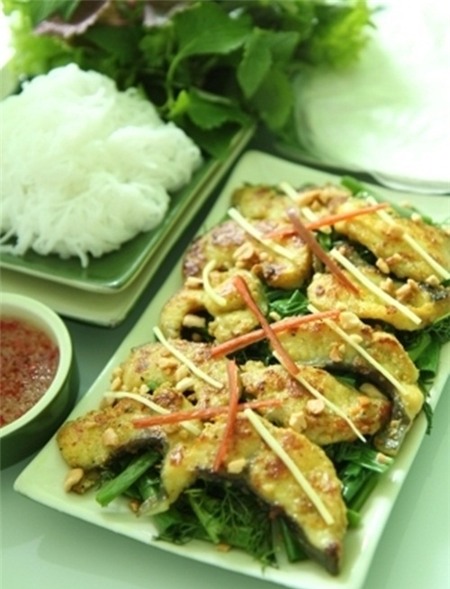 - Cá xếp nguyên con ra đĩa, khi ăn thì cắt miếng vừa để cuốn với rau, thoa đều mỡ hành và rắc đậu phộng lên cá.