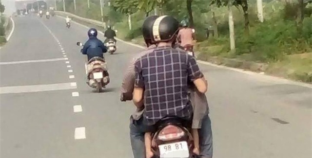 Khi người phụ nữ quay sang hỏi thì nam thanh niên điều khiển xe máy có vẻ hoảng hốt, còn người ngồi sau thì hất chiếc áo trùm người cháu bé nên để thể hiện cháu bé vẫn thở được.