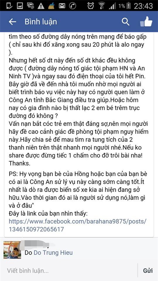 Trong đoạn tâm trạng đăng trên mạng xã hội, người đăng tải cũng nói muốn nhờ bạn bè hoặc người quen làm ở Công an tỉnh Bắc Giang điều tra giúp vụ việc này hoặc có gia đình nào thông báo bị thất lạc 2 em bé trên trục đường Láng - Hòa Lạc hay không.