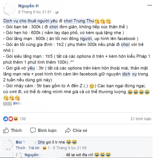 Vì thế, những dòng trạng thái cho thuê người yêu đi chơi trung thu cũng xuất hiện dày đặc, tuy nhiên, thực hư của những câu chuyện này thì chưa được kiểm chứng.