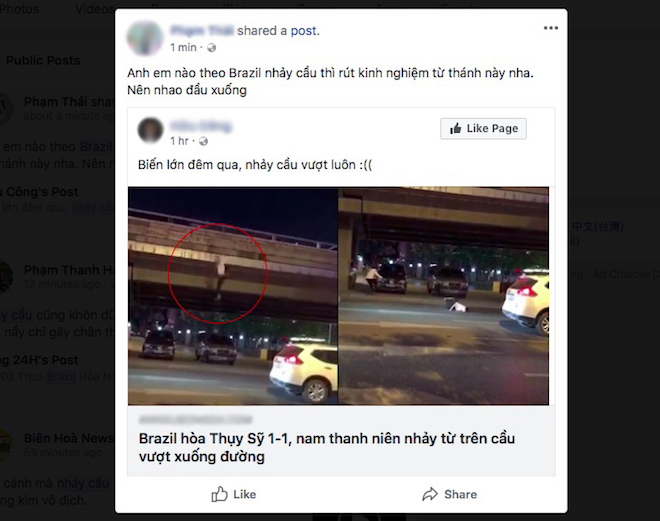 Tin tức giả mạo về vụ một nam thanh niên nhảy cầu sau trận Brazil chia điểm với Thụy Sĩ, nhưng vẫn được cư dân mạng nhấn nút chia sẻ. (Ảnh chụp màn hình)