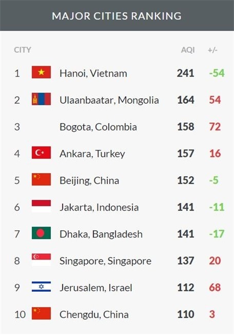 Như vậy, trong sáng nay, Hà Nội đang là thành phố ô nhiễm thứ nhì thế giới. Chỉ số ô nhiễm của Hà Nội chỉ thấp hơn thành phố Ardhali Bazar của Ấn Độ (471) và cao hơn rất nhiều so với những thành phố còn lại có số liệu được thống kê.