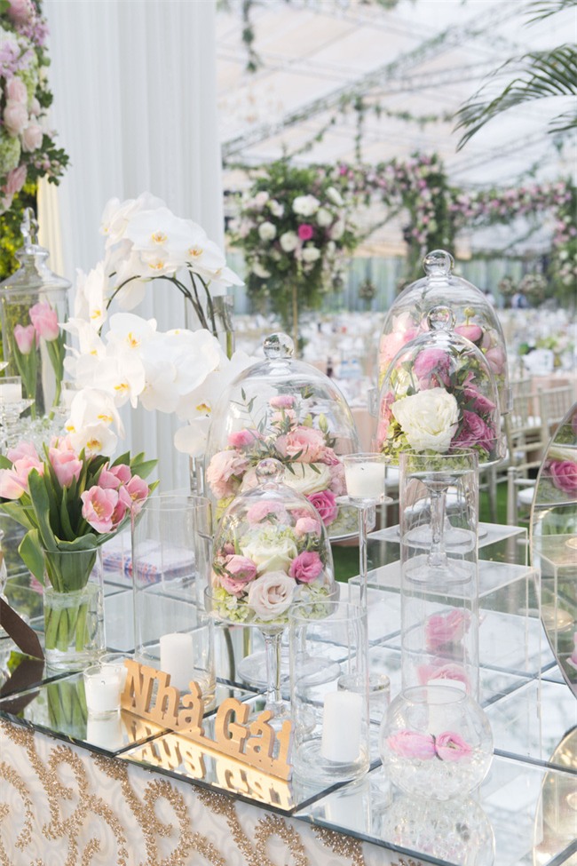 Chú rể Lâm Duy cũng đặc biệt đề nghị sử dụng một loại hoa khá đặc biệt trong đám cưới đó là hoa sen. "Vì mùa này Việt Nam chưa có sen nên toàn bộ đều được nhập khẩu. Chúng mình đã mix hoa sen trắng cùng với địa lan hồng, gắn tag "Thank you" tự thiết kế, bên cạnh đó là một chậu hoa đá, một chậu dương xỉ để làm hoa để bàn tiệc. Sau tiệc khách mời có thể cầm về thay quà cảm ơn", chị Hương Nguyễn chia sẻ.