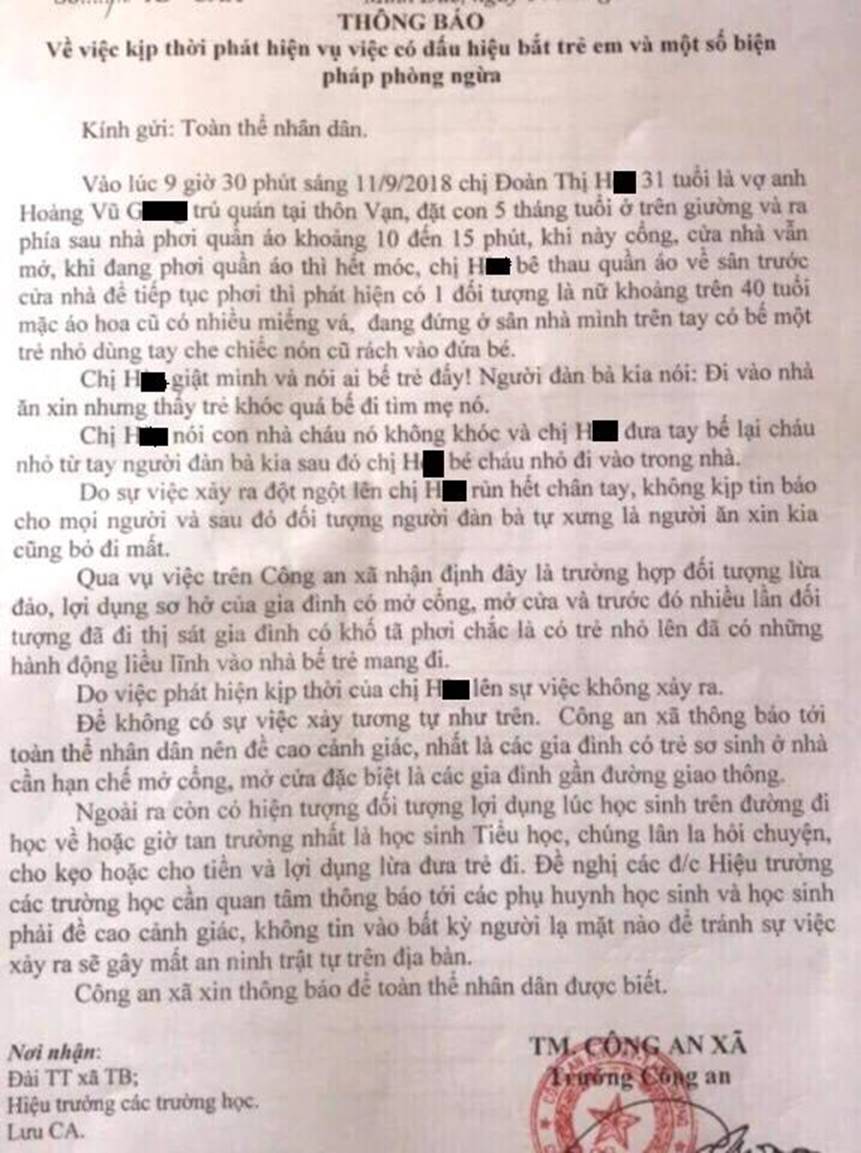Cũng theo ông Thường, khi nắm bắt nguồn tin từ nhân dân được biết, trước khi xảy ra vụ việc, người dân địa phương có nhìn thấy một người đàn ông đi xe máy đèo theo người phụ nữ (giống mô tả chị H.) đi về phía cổng nhà cháu Đ. Đây cũng là vụ việc xảy ra lần đầu tiên trên địa bàn, nhưng thông tin bắt cóc trẻ nhỏ ở một số nơi thì người dân xã Minh Đức đều biết.