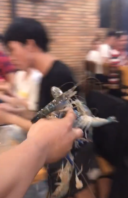 Vừa mới được bưng ra quầy cung cấp đồ ăn, chậu tôm càng đã nhanh chóng "bốc hơi" trong vòng vài giây chỉ vì hàng chục thực khách đứng cạnh chờ sẵn, lao vào giành giật nhau như cảnh phim! Những người lấy được tôm thì cười vui hớn hở, còn ai không nhanh nhẹn thì đành quay trở về tay không. Nửa cuối clip còn quay cảnh một vị khách nam nhanh tay bốc được mớ tôm to chạy về bàn của mình, còn những người xung quanh không kịp lấy tôm thì ngơ ngác tiếc nuối.