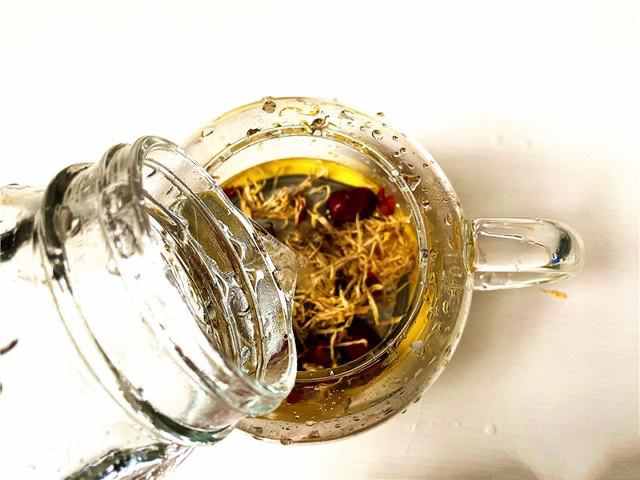 Bước 3: Hoa cúc tráng qua với nước nóng sau đó để vào trong cốc hoặc bình. Phần nguyên liệu trà sau khi đun sôi đổ vào bình có để hoa cúc. Đợi trà ngấm khoảng 5 phút là được.