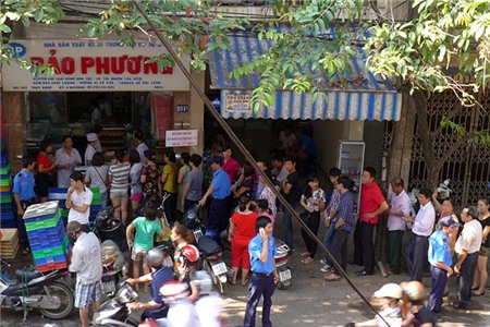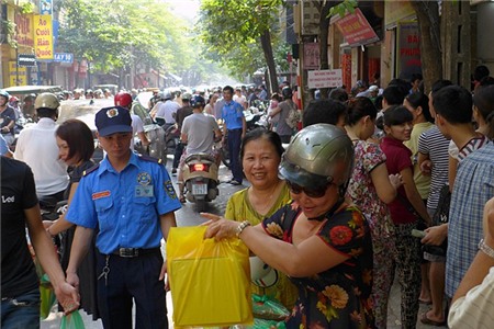 Chăng dây làm hàng rào xếp hàng trên vỉa hè chạy dài hàng trăm mét trước cửa hàng.
