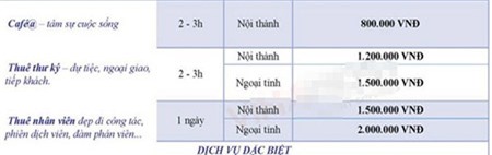 M.M cũng cho biết, nếu thuê qua đêm hoặc bao trọn một ngày, mức giá có thể nhân lên gấp 4-5 lần. "Nếu đi hết đêm có thể sẽ khoảng 4 triệu, cả ngày sẽ khoảng 5-6 triệu đồng". Theo M.M, đây là mức giá "ưu đãi" vì thời điểm này, các bên cung ứng dịch vụ đều rất "khan hàng" nên chuyện giá cả bị đẩy lên cao là điều hết sức bình thường.