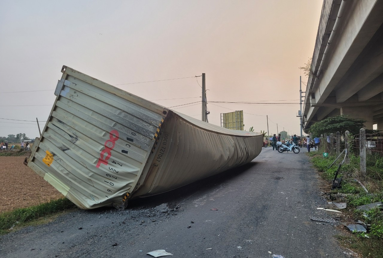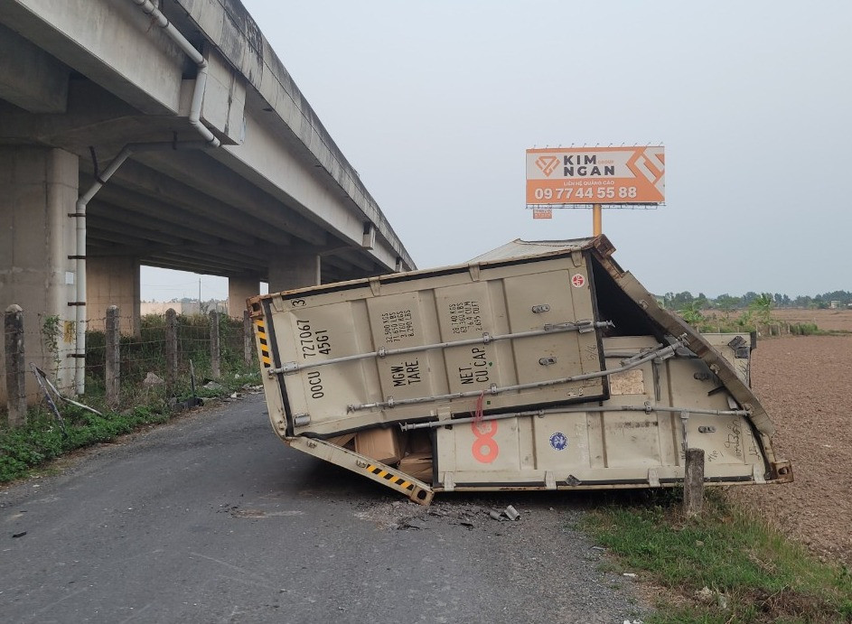 Thùng hàng biến dạng sau khi rơi khỏi đường cao tốc TP.HCM - Trung Lương.