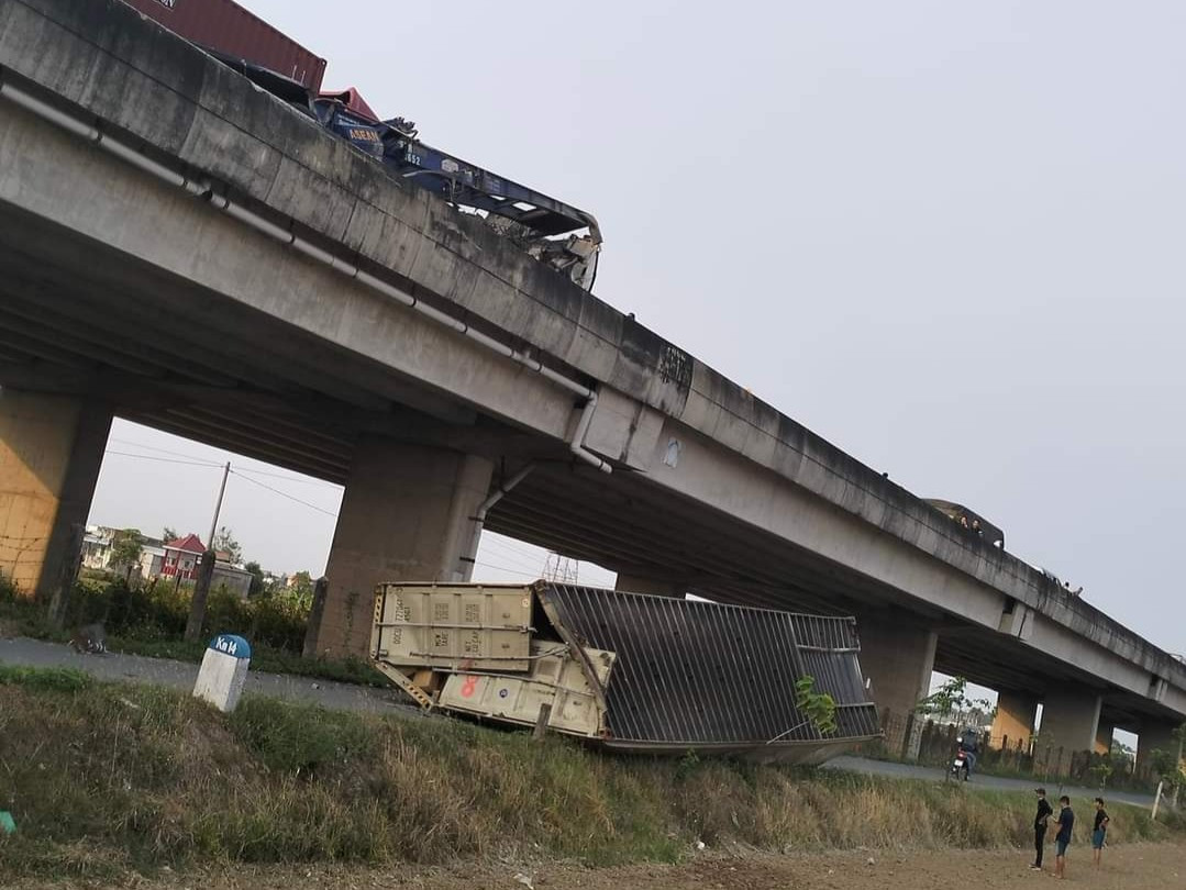 Sau cú đánh lái, xe container đâm mạnh vào thành cầu cao tốc đoạn trên cao. Thùng hàng loại 20 feet đã bị đứt chốt, văng xuống đường dân sinh từ độ cao 15m.