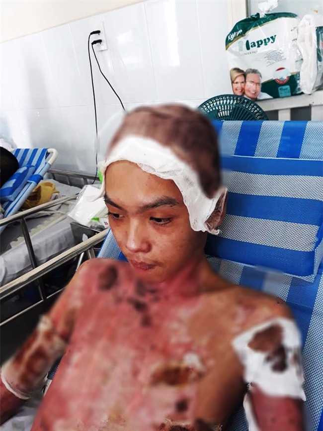 Sau khi sơ cứu, Tiến được đưa lên BV Chợ Rẫy với chẩn đoán bỏng lửa 46% độ 2-3, 33% độ 3 toàn thân. Diện tích bỏng sâu nhiều, lên đến 33%, lại bỏng ở những vùng có thể lấy da cấy ghép được như tay, chân.