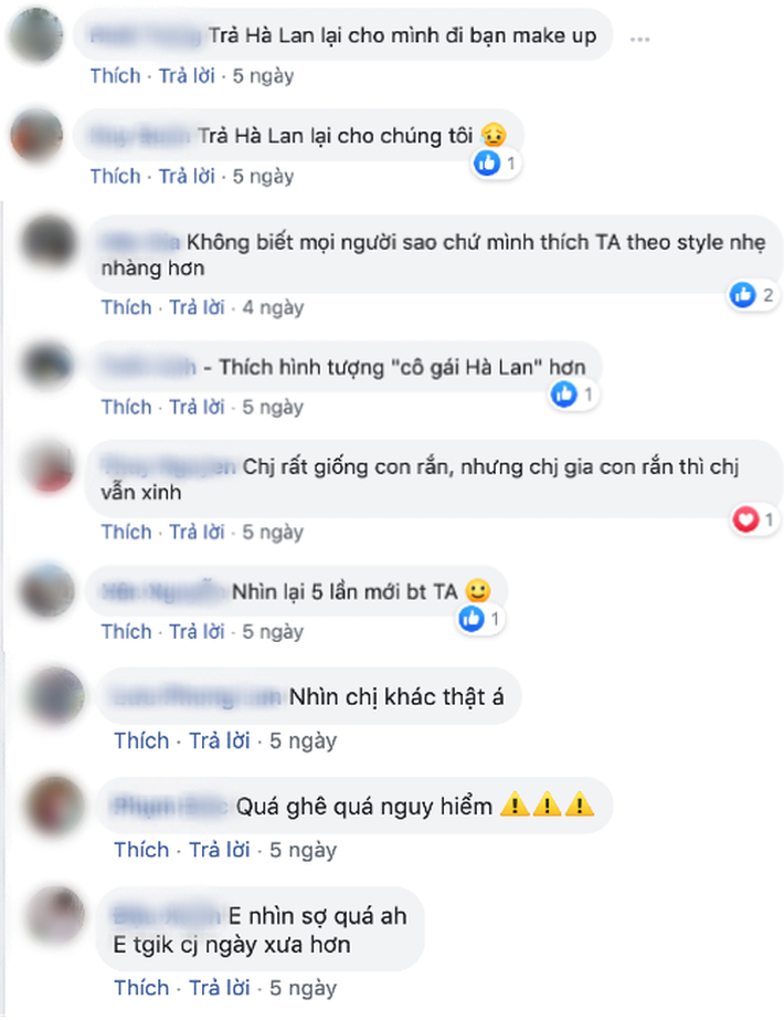 Ngỡ rằng màn "lột xác" sẽ khiến Trúc Anh trở nên ấn tượng hơn, tuy nhiên cô lại gây thất vọng với quả đầu tổ quạ, mắt xếch như phù thuỷ. Nếu không nói, chắc chẳng ai nhận ra người trong ảnh là "Hà Lan" ngây thơ, trong sáng ngày nào.