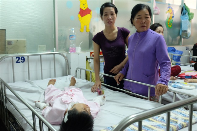 Ngồi cạnh bên, bà Lê Thị Mình (56 tuổi, bà ngoại đứa bé) nhìn cháu bằng cặp mắt đỏ hoe. Bà như không tin vào sự thật đang diễn ra, khi mới hơn 1 tuần trước, cháu bà vẫn còn là một đứa trẻ khỏe mạnh, hoạt bát.