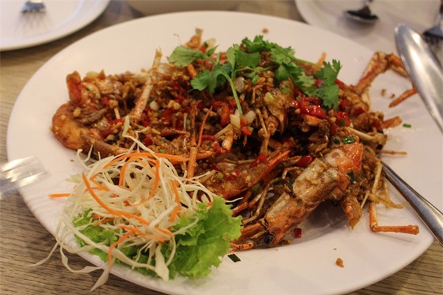 2. Tôm càng cháy tỏi ớt: Tùy kích thước tôm, đầu bếp có thể giữ nguyên con hay chẻ đôi. Giá 400 bath một ký.