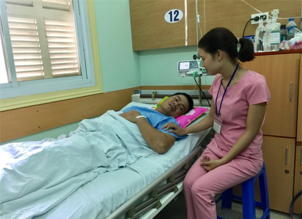 Trưa 6/7, Thượng úy Đức vẫn còn rất yếu, anh đang được vợ chăm sóc tại BV Việt Đức