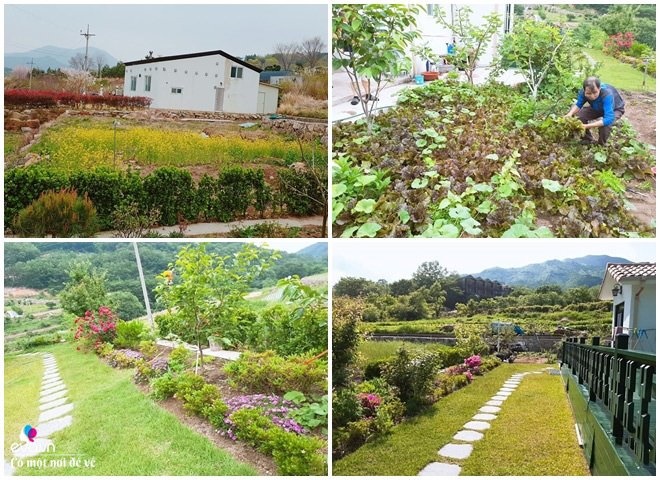 “Khu vườn nhà bố chồng mình có hoa hồng, hoa cúc, hoa cải, hoa cẩm chướng, hoa bướm, hoa vạn thọ, hoa mào gà. Các loại rau như xà lách, hành lá, hành tây, tỏi, bắp cải, cà rốt, khoai tây, khoai lang, cây hẹ và các loại cây ăn trái như táo tàu, cây sung, cây đào, mơ, cherry, nhót, táo , hồng, việt quất. Nhà được bố chồng mình yêu cầu thiết kế cao hơn hẳn vườn, đằng trước và cạnh mặt nhà đều là lan can để cho mẹ chồng mình ngồi đó có thể quan sát hết mọi thứ ngoài khu vườn hay sân cỏ”, chị Dịu chia sẻ.