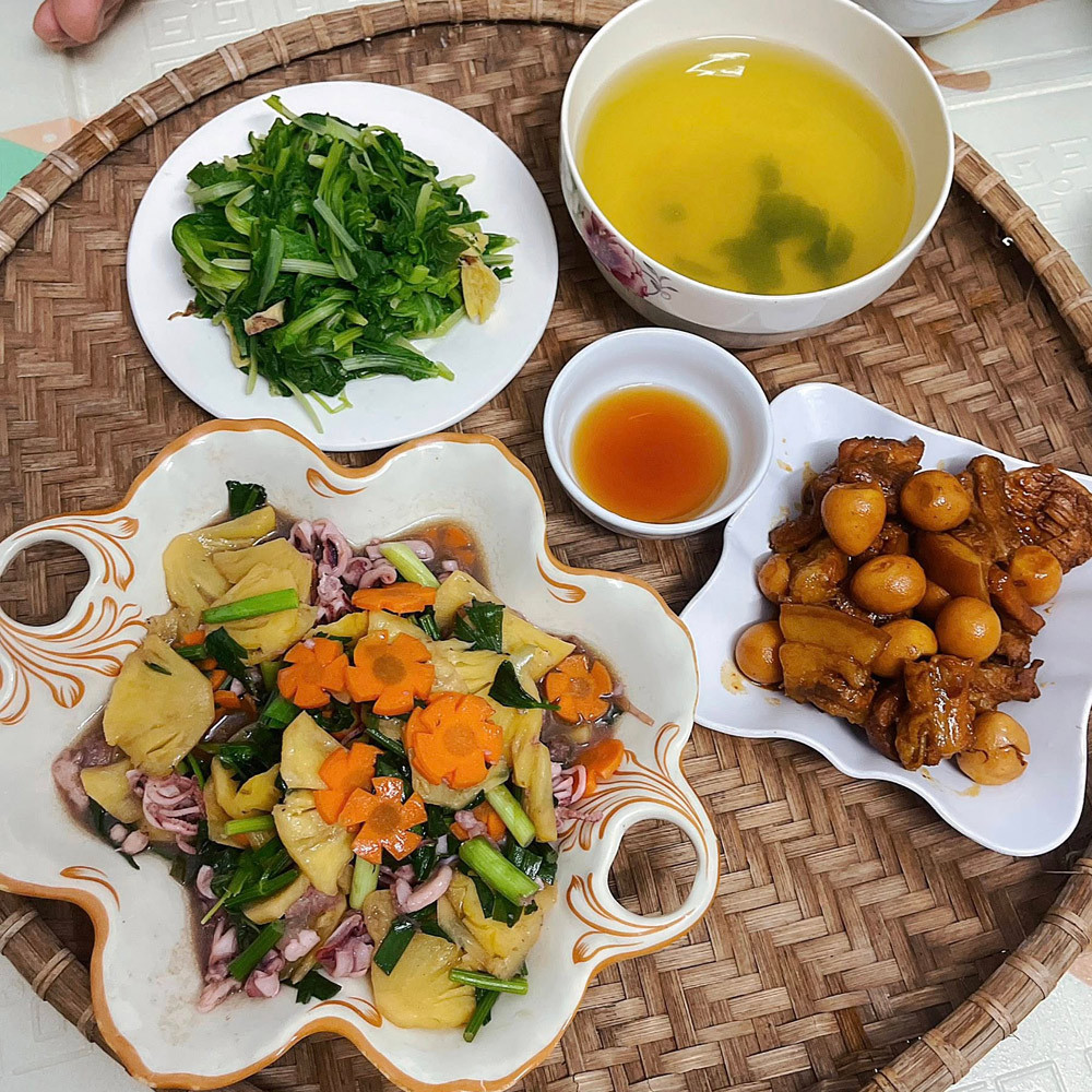Với những bữa cơm chồng tự tay nấu nướng, bài trí, Vui hạnh phúc đến nỗi thường chụp lại làm kỷ niệm trước khi ăn. Mâm cơm có khi cầu kỳ, đôi khi đơn giản nhưng luôn có một món rau, một món canh, một món mặn... và đủ các nhóm chất đạm, xơ, tinh bột...