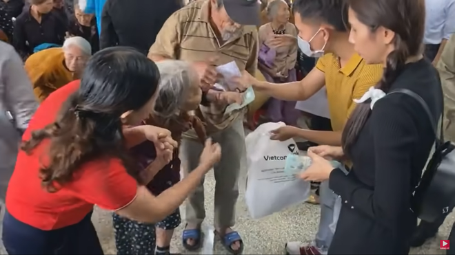 "Khoan khoan, bây giờ con thấy người lớn tuổi, khó khăn về đi lại ở đây rất nhiều nên các cô bác lớn tuổi cứ ngồi tại chỗ, con sẽ đến từng người phát tiền".