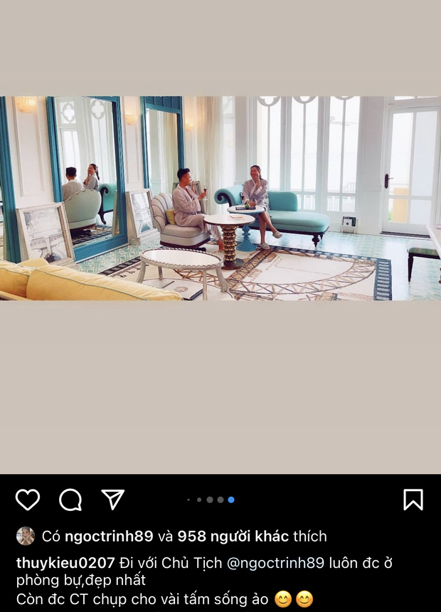 Mới đây nhất, Thuý Kiều khoe được Ngọc Trinh bao trọn gói đi nghỉ ở resort hạng sang tại Phú Quốc. Dân tình phải nói là ghen tị nổ cả mắt bởi vì không những đi "ké" chủ tịch thì chẳng phải tốn đồng nào, Thuý Kiều còn hưởng trọn những đặc quyền khác như được Ngọc Trinh cho ở phòng to đùng, còn chụp ảnh sống ảo cho nữa...