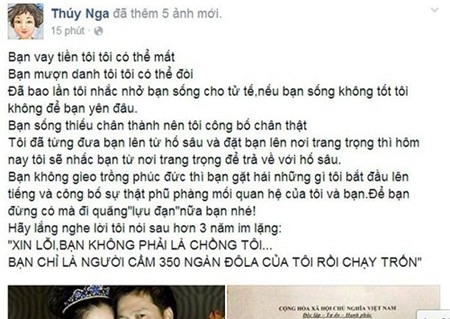 Cô viết: "Bạn vay tiền của tôi, tôi có thể mất. Bạn mượn danh của tôi, tôi có thể đòi. Đã bao lần tôi nhắc nhở bạn sống cho tử tế. Nếu bạn sống không tốt tôi không để bạn yên đâu. Bạn sống thiếu chân thành nên tôi công bố chân thật. Tôi từng đưa bạn lên từ hố sâu và đặt bạn lên nơi trang trọng thì hôm nay tôi sẽ nhấc bạn từ nơi trang trọng để trả về với hố sâu. Bạn không gieo trồng phúc đức thì bạn gặt hái những gì tôi bắt đầu lên tiếng và công bố sự thật phũ phàng mối quan hệ của tôi và bạn. Để bạn đừng có mà đi quăng lựu đạn nữa bạn nhé! Hãy lắng nghe lời tôi nói sau hơn 3 năm im lặng: Xin lỗi, bạn không phải chồng tôi. Bạn chỉ là người cầm 350.000 USD của tôi rồi chạy trốn".