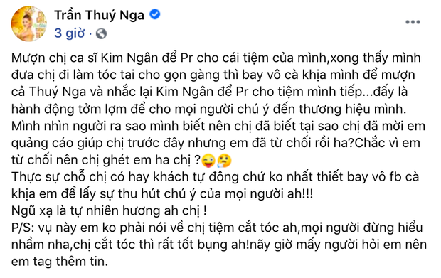 Nguyên văn chia sẻ của danh hài Thuý Nga như sau: "Mượn ca sĩ Kim Ngân để PR cho cái tiệm của mình. Xong thấy Nga đưa ca sĩ Kim Ngân đi làm tóc tai cho gọn gàng thì bay vô cà khịa, mượn cả Thúy Nga và nhắc lại Kim Ngân để PR cho tiệm mình tiếp. Đấy là hành động tởm lợm để cho mọi người chú ý đến thương hiệu mình. Nga nhìn người ra sao Nga biết, nên chị đã biết tại sao chị mời Nga quảng cáo giúp chị trước đây nhưng Nga đã từ chối rồi ha? Chắc vì Nga từ chối nên chị ghét Nga ha chị? Thực sự chỗ chị có hay thì khách tự đông, chứ không nhất thiết bay vô Facebook cà khịa em để thu hút chú ý của mọi người. Hữu xạ tự nhiên hương nha chị".