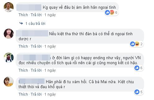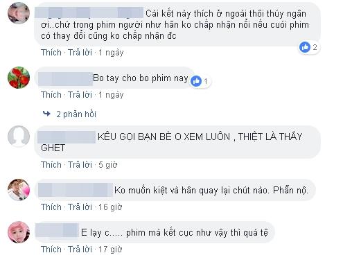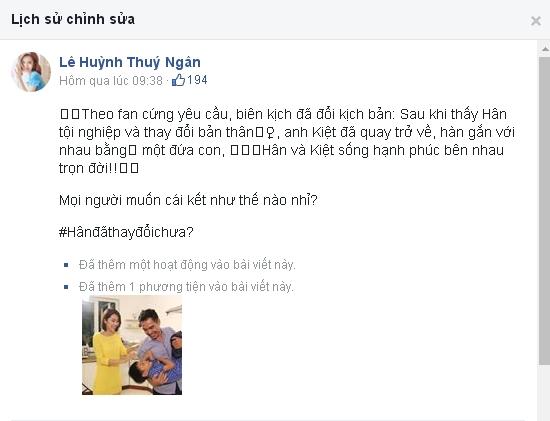 Nguyên văn dòng chia sẻ của Thúy Ngân: "Theo fan cứng yêu cầu, biên kịch đã đổi kịch bản: Sau khi thấy Hân tội nghiệp và thay đổi bản thân, anh Kiệt đã quay trở về, hàn gắn với nhau bằng một đứa con. Hân và Kiệt sống hạnh phúc bên nhau trọn đời!! Mọi người muốn cái kết như thế nào nhỉ. Hân đã thay đổi chưa?"