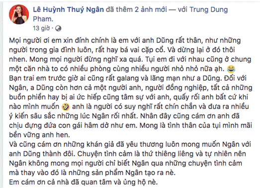 Trên trang cá nhân của mình, Thuý Ngân đã lên tiếng đính chính về thông tin Trung Dũng tiết lộ trong bài phỏng vấn của anh. Thuý Ngân chia sẻ, cô xem Trung Dũng như những người trong gia đình và rất hay "bá vai cặp cổ". Thế nhưng, cả hai chỉ dừng lại ở đó. Cô mong mọi người đừng nghĩ quá xa. Bên cạnh đó, Thuý Ngân cũng chia sẻ, cô và Trung Dũng ở chung một căn nhà to có nhiều phòng và cả hai cũng ở chung phòng với nhiều người khác.