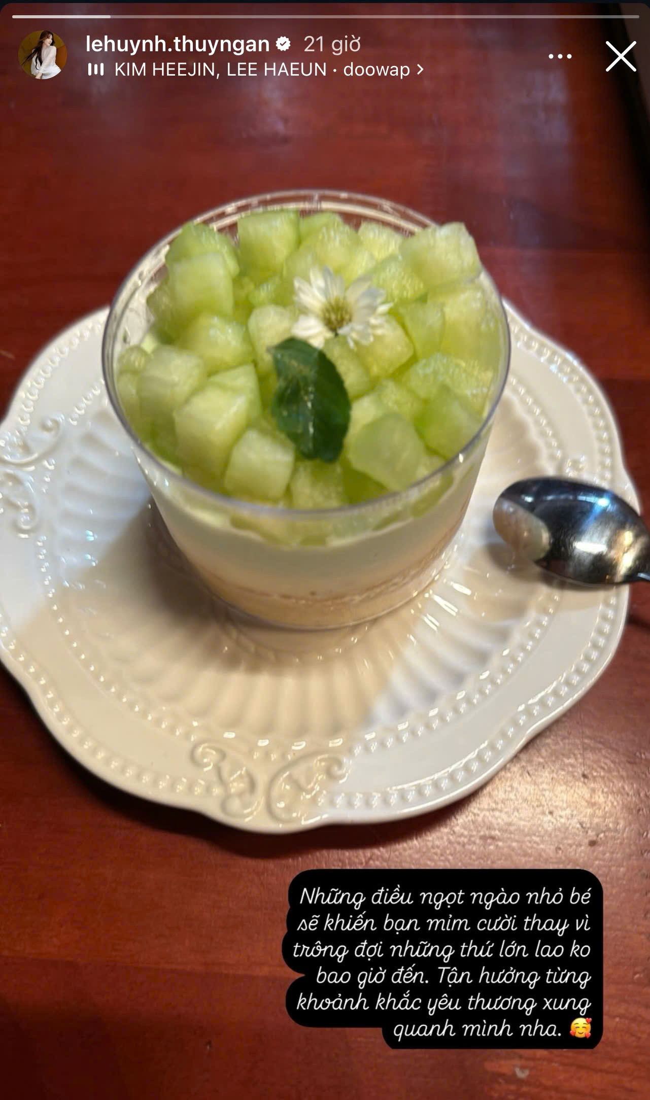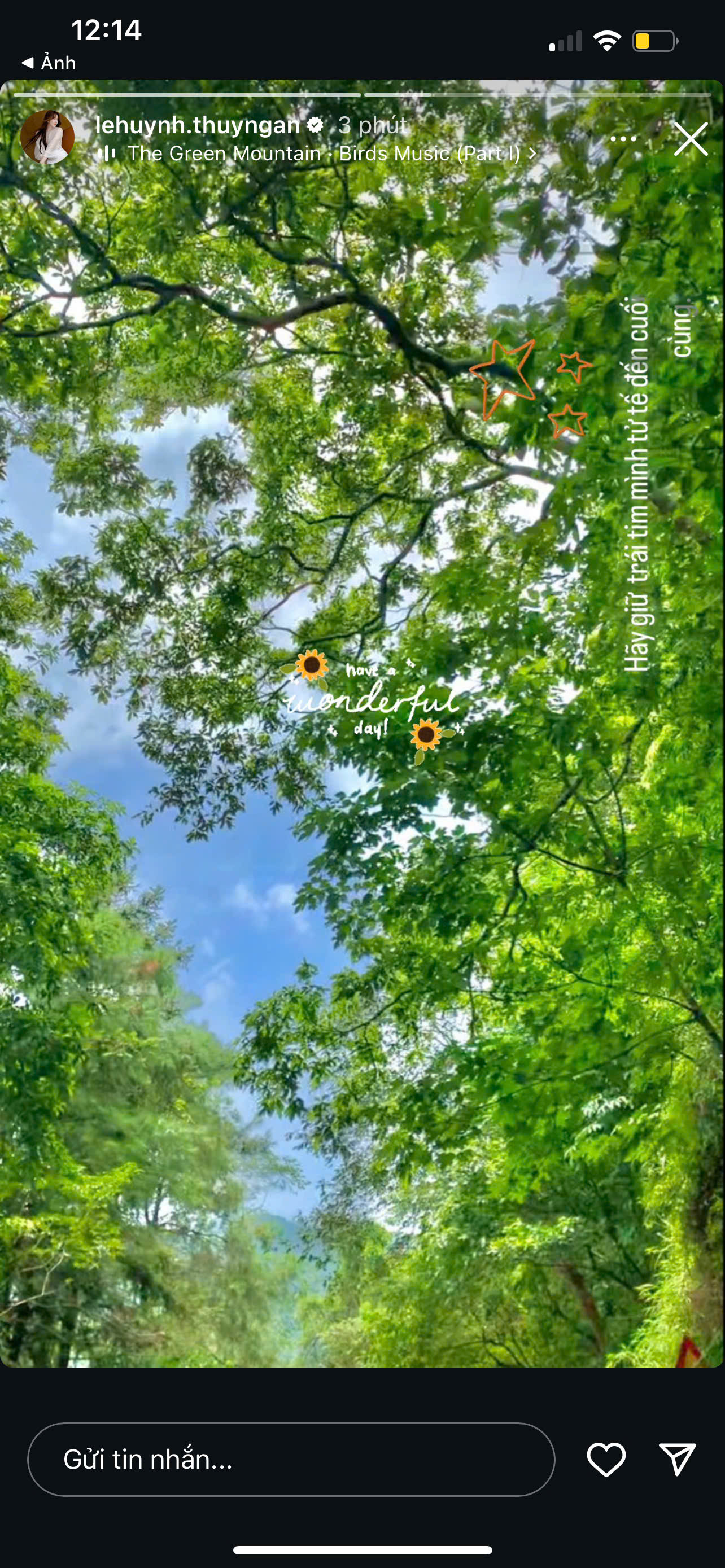 Cô viết: "Những điều ngọt ngào nhỏ bé sẽ khiến bạn mỉm cười thay vì trông đợi những thứ lớn lao không bao giờ đến. Tận hưởng từng khoảnh khắc yêu thương xung quanh mình nha". Ở một story khác, Thúy Ngân chia sẻ hình ảnh chụp phong cảnh và viết dòng chú thích: "Hãy giữ trái tim mình tử tế đến cuối cùng".