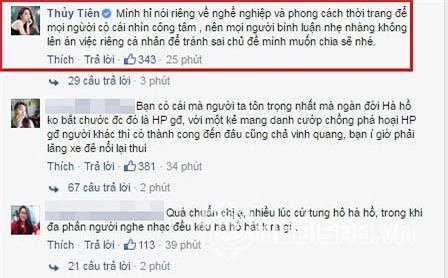Sau khi đọc được những bài báo cho rằng Thủy Tiên hot nhờ bắt chước phong cách của Hà Hồ, nữ ca sĩ này đã bức xúc lên tiếng. Thủy Tiên chia sẻ: "Gửi ai nói ca sỹ Việt trong đó cả mình bắt chước phong cách Hà Hồ nhất là các phóng viên là fan và thân cận Hà nhé. Tất cả châu Á này đều phải học hỏi và bắt chước xu hướng của Mỹ. Cả nền âm nhạc và thời trang Hàn Quốc hay Thái, Trung... Đều phải học hỏi xu hướng thế giới từ nước đi đầu là Mỹ rồi kết hợp văn hoá nước mình... Nữ châu Á thì học hỏi phong cách của Madona, j.lo, Britney, Beyonce, Rihana.. Còn nam thì từ Justin hay Bi Rain đều học hỏi Micheal Jackson. Riêng show đỉnh của thế giới như Victoria Secret cũng lấy cảm hứng trang phục đôi cánh từ các trang phục lễ hội carnaval của Brazil.. Bởi vì nền giải trí của mình quá mới còn nền giải trí của họ là chuyên nghiệp cách mình cả trăm năm.