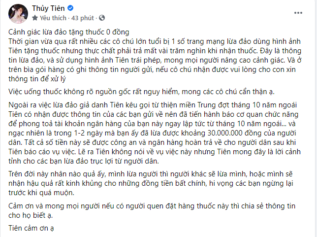 Cảnh giác lừa đảo tặng thuốc 0 đồng. Thời gian vừa qua rất nhiều các cô chú lớn tuổi bị 1 số trang mạng lừa đảo dùng hình ảnh Tiên tặng thuốc nhưng thực chất phải trả mất vài trăm nghìn khi nhận thuốc. Đây là thông tin lừa đảo, và sử dụng hình ảnh Tiên trái phép, mong mọi người nâng cao cảnh giác. Và ở trên bìa gói hàng có ghi thông tin người gửi, nếu cô chú nhận được vui lòng cho con xin thông tin để xử lý. Việc uống thuốc không rõ nguồn gốc rất nguy hiểm, mong các cô chú cẩn thận ạ. Ngoài ra việc lừa đảo giả danh Tiên kêu gọi từ thiện miền Trung đợt tháng 10 năm ngoái Tiên có nhận được thông tin của các bạn gửi về nên đã tiến hành báo cơ quan chức năng để phong tỏa tài khoản ngân hàng của bạn này ngay lập tức từ tháng 10 năm ngoái... Và ngạc nhiên là trong 1-2 ngày mà bạn ấy đã lừa được khoảng 30.000.000 đồng của người dân. Tất cả số tiền này sẽ được công an và ngân hàng hoàn trả về cho người dân sau khi Tiên báo cáo vụ việc. Lẽ ra Tiên không nói về vụ việc này nhưng Tiên mong đây là lời cảnh tỉnh cho các bạn lừa đảo trục lợi từ người dân. Trên đời này nhân nào quả ấy, mình lừa người thì người khác sẽ lừa mình, hoặc mình sẽ nhận hậu quả rất kinh khủng cho những đồng tiền bất chính, hi vọng các bạn ngừng lại trước khi quá muộn. Cảm ơn và mong mọi người nếu có người quen đặt hàng thuốc này thì chia sẻ thông tin cho họ biết ạ. Tiên cảm ơn ạ. |