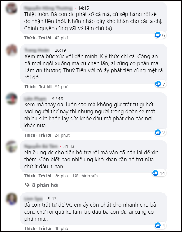 Hàng loạt bình luận trên livestream cũng trách cứ sao người dân lại mất bình tĩnh như thế. Mặc dù vậy, Thủy Tiên vẫn nhẹ nhàng an ủi tất cả mọi người, lý giải sự hỗn loạn này 'Tại vì ở đây ngập lâu và sâu quá, không có đoàn viện trợ nào qua đây được, đi lại khó khăn lắm. Ở đây dân cũng đông nữa nên họ không quen có người vào viện trợ, họ bị hoang mang vì mất quá nhiều nên mới hỗn loạn như vậy, mọi người thông cảm cho họ nhé'