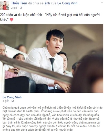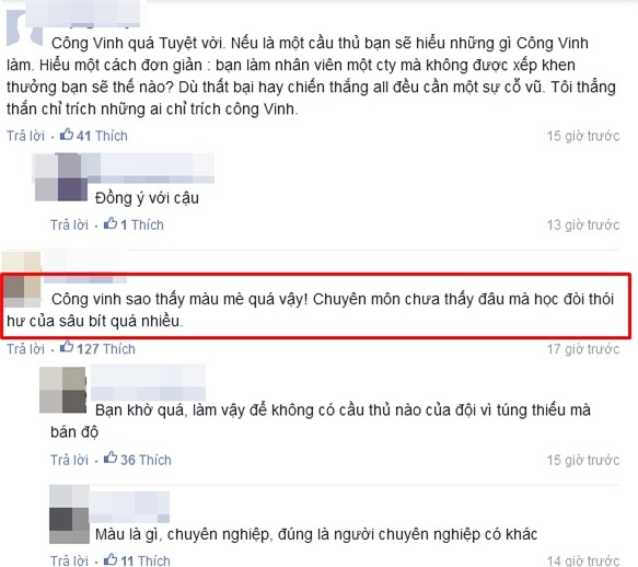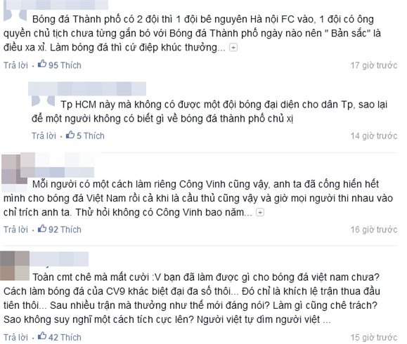 Hay: Một cậu thủ như công vinh xứng đáng được tôn trọng hơn rất nhiều. Vì bóng đá Việt Nam, hãy khuyến khích những người giám làm như Công Vinh. Và biện minh: Toàn bình luận chê mà mắc cười: Bạn đã làm được gì cho bóng đá Việt Nam chưa? Cách làm bóng đá của CV9 khác biệt đại đa số thôi... Đó chỉ là khích lệ trận thua đầu tiên thôi... Sau nhiều trận mà thưởng như thế mới đáng nói? Làm gì cũng chê trách? Sao không suy nghĩ một cách tích cực lên? Người Việt tự dìm người Việt ...