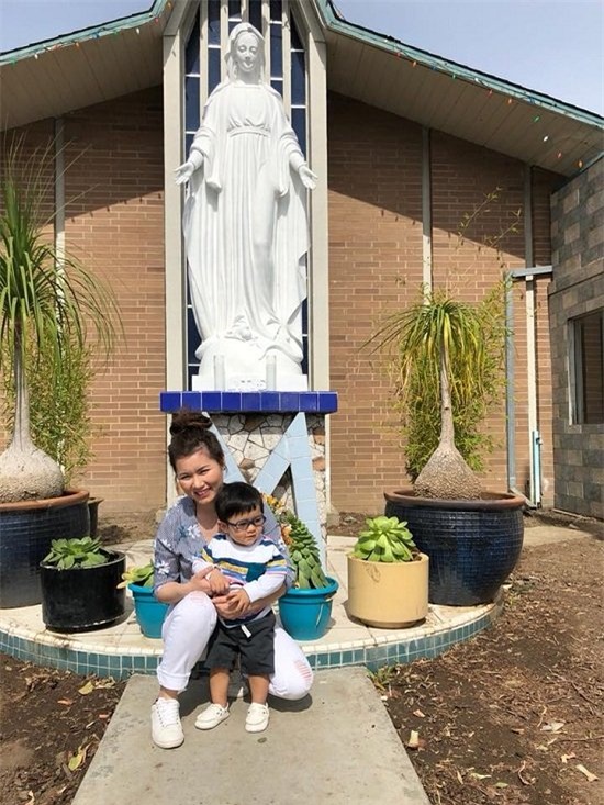 | Bà xã ca sĩ Đan Trường đưa con trai Thiên Từ đến nhà thờ cầu nguyện nhân ngày lễ phục sinh ở Mỹ. |