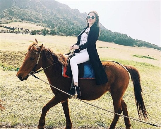 | Ca sĩ Bảo Thy phấn khích vì được trải nghiệm cảm giác ngồi trên lưng ngựa. Cô hóm hỉnh viết: “Nếu không sợ có sẹo thì lên ngựa Thy đèo”. |