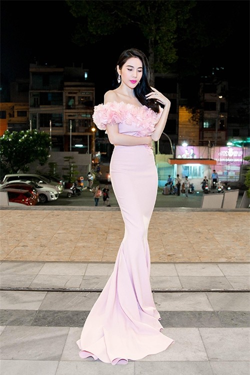 Thủy Tiên khoe hình thể "siêu mẫu" trong chiếc đầm đuôi cá màu hồng nhạt. Phần cúp ngực của chiếc váy được đáp bằng những "cánh hoa" mong manh. Màu hồng nhạt của chiếc váy giúp tone làn da trắng của Thủy Tiên. Cô cũng chọn son hồng cánh sen để làm đẹp thật ăn ý với trang phục.