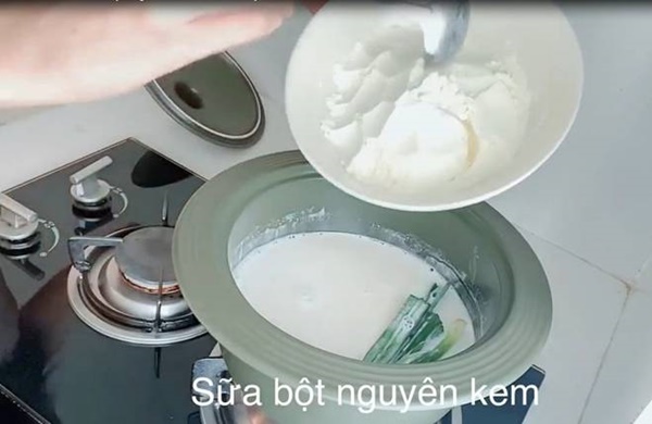 Đảo đều rồi cho sữa bột nguyên kem, khuấy cho tan.