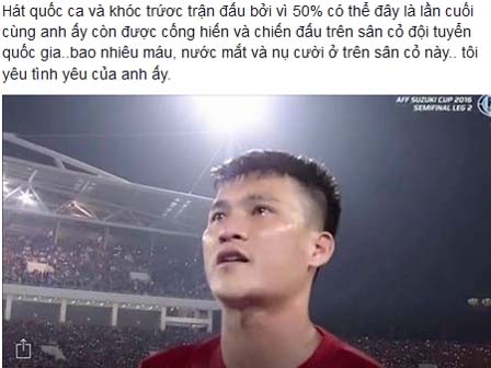 trong cuộc tái đấu này, do đó ngay khi mở màn tiền đạo Lê Công Vinh đã rất xúc động và rơi lệ trong khoảnh khắc hát Quốc ca Việt Nam. Nhìn giọt nước mắt của ông xã lăn dài trên má, nữ ca sỹ Thủy Tiên đã xúc động chia sẻ hình ảnh cùng những dòng cảm xúc bộc bạch nỗi lòng mình. Lời tâm sự