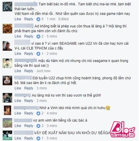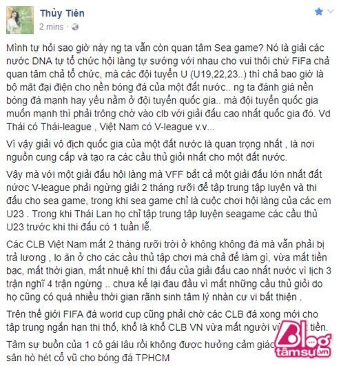 Thủy Tiên cho biết: “Mình tự hỏi sao giờ này người ta vẫn còn quan tâm Seagame? Nó là giải các nước ĐNA tự tổ chức hội làng tự sướng với nhau cho vui thôi chứ FiFa chả quan tâm chả tổ chức, mà các đội tuyển U (U19,22,23..) thì chả bao giờ là bộ mặt đại điện cho nền bóng đá của một đất nước. Người ta đánh giá nền bóng đá mạnh hay yếu nằm ở đội tuyển quốc gia. Mà đội tuyển quốc gia muốn mạnh thì phải trông chờ vào CLB với giải đấu cao nhất quốc gia đó. Ví dụ: Thái có Thái-League , Việt Nam có V-League ...