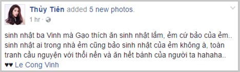 "Sinh nhật ba Vinh mà Gạo thích ăn sinh nhật lắm, ẻm cứ bảo của ẻm. Sinh nhật ai trong nhà ẻm cũng bảo sinh nhật của ẻm không à, toàn tranh cầu nguyện với thổi nến và ăn hết bánh của người ta ha ha ha", Thủy Tiên tranh thủ kể tội "tật xấu" của cô con gái dễ thương.