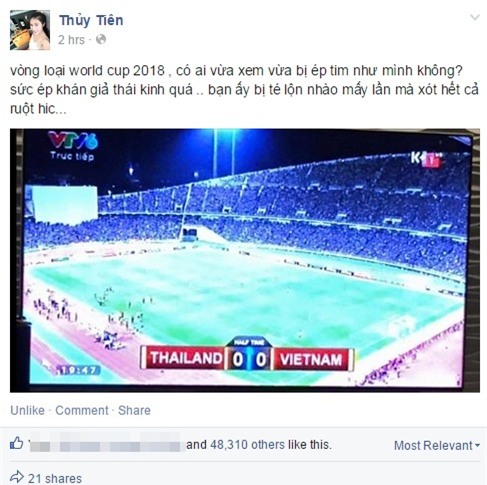 Không có mặt cùng chồng sang Thái nhưng Thủy Tiên vẫn đồng hành cùng anh và ĐT Việt Nam trong suốt 90 phút tại "chảo lửa" Rajamangala qua màn hình tivi. Chứng kiến đức lang quân liên tục ngã trên sân, cô ca sĩ xinh đẹp không khỏi xót xa. Thủy Tiên sau đó đã chia sẻ 1 dòng status với nội dung: "Vòng loại World Cup 2018, có ai vừa xem vừa bị ép tim như mình không? Sức ép khán giả Thái kinh quá... Bạn ấy bị té lộn nhào mấy lần mà xót hết cả ruột hic..."