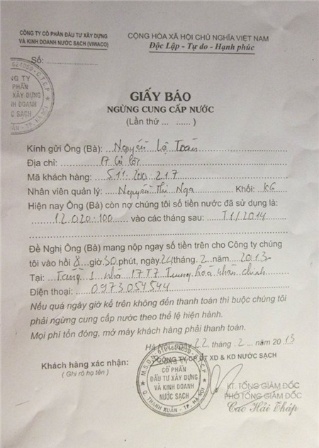 Viwaco có thông báo nếu không đóng tiền sẽ cắt nước. |