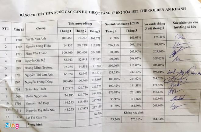 Anh Nguyễn Trung Dũng, đại diện cho cư dân tầng 17 ĐN2 The Golden An Khánh cho hay sau khi đối chiếu tiền điện của các hộ trong tầng trong tháng 1- 2-3/2018, anh thấy tiền nước tăng đột biến.